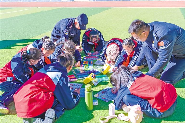 图为亚东出入境边防检查站的民警和学生一同创作“宪法伴我成长”手抄报。通讯员 李锦辉 摄