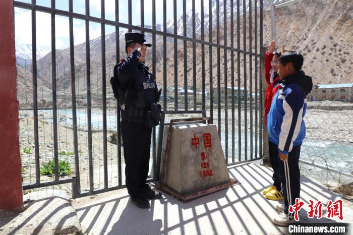 图为普兰边检站移民管理警察与驻地学校学生在界碑前相互敬礼。格热 摄