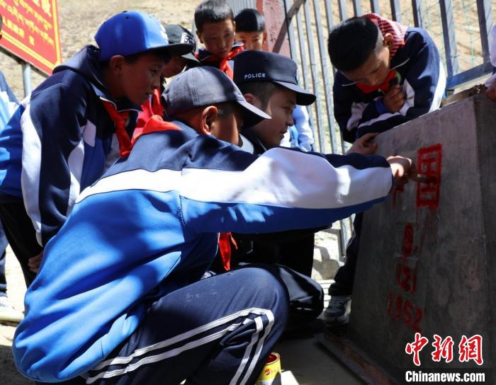 图为普兰边检站移民管理警察与驻地学校学生共同为界碑描红。格热 摄