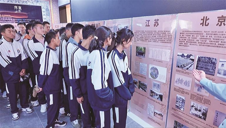 学生观看禁毒先驱林则徐生平史绩全国联展展板。文/图 记者 张雪芳
