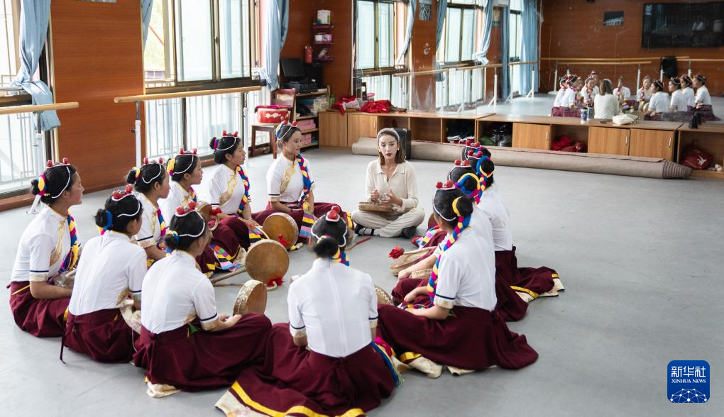 9月9日,在拉萨市第二中等职业技术学校,孩子们在热巴舞练习间隙听尼玛卓玛老师(左二)讲热巴舞的发展历程。新华社记者 张笑宇 摄
