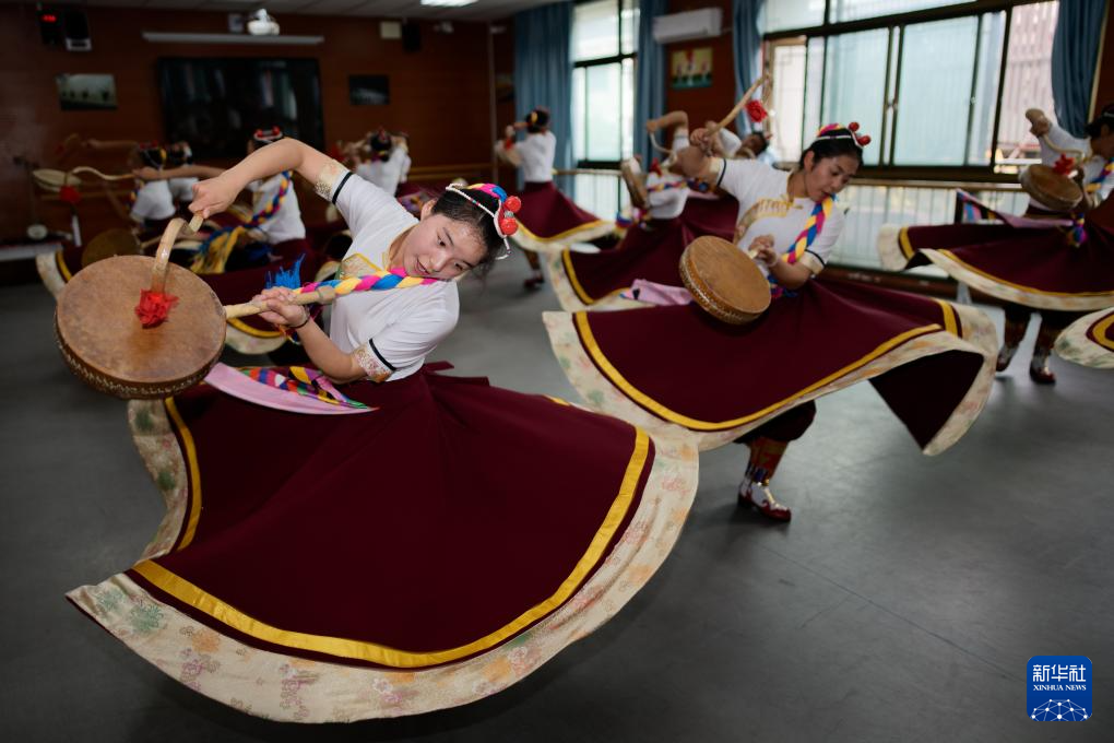 9月9日,在拉萨市第二中等职业技术学校,孩子们在练习热巴舞。新华社记者 张笑宇 摄