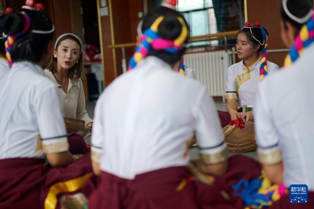 9月9日,在拉萨市第二中等职业技术学校,尼玛卓玛老师(左三)在指导孩子们舞蹈动作。新华社记者 晋美多吉 摄