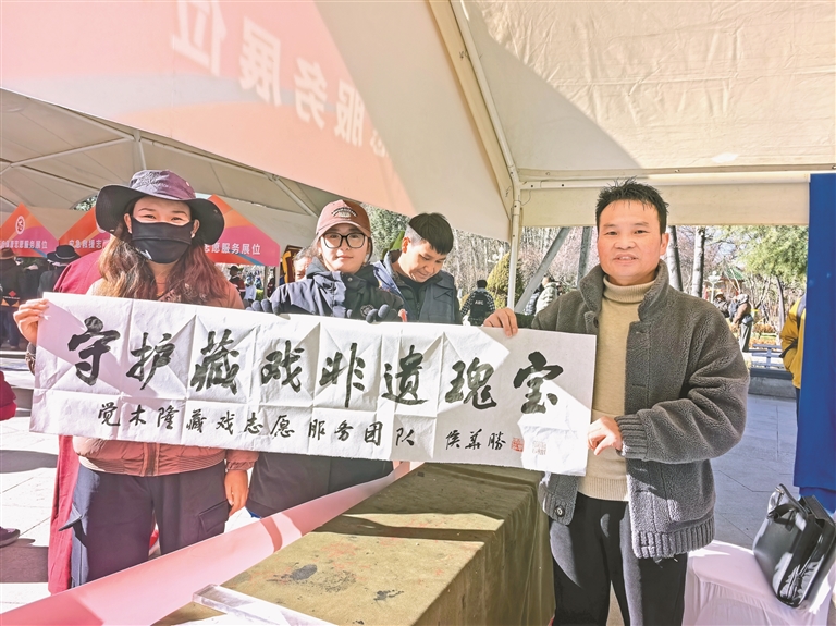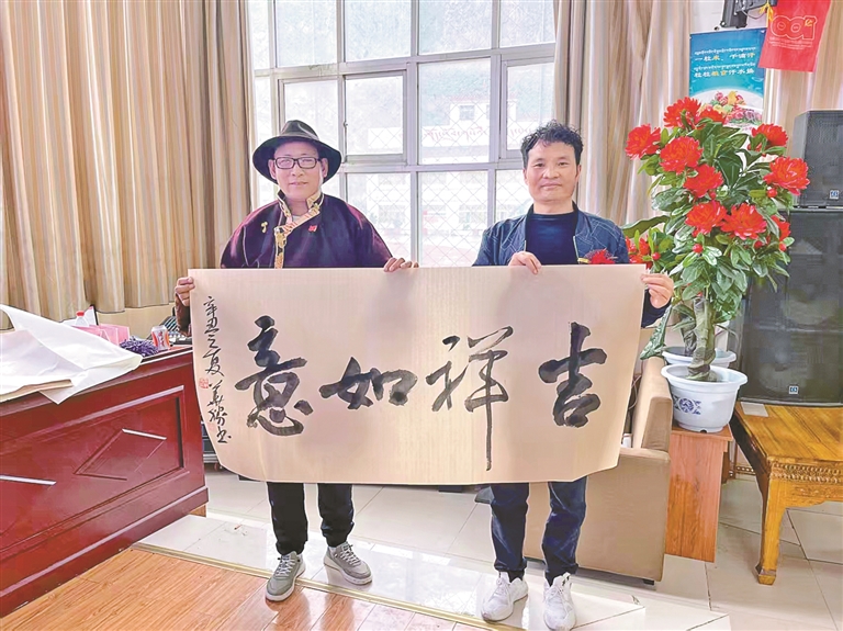 图为侯华胜为觉木隆藏戏志愿者团队赠送书法作品。图/ 文 记者 卢文静