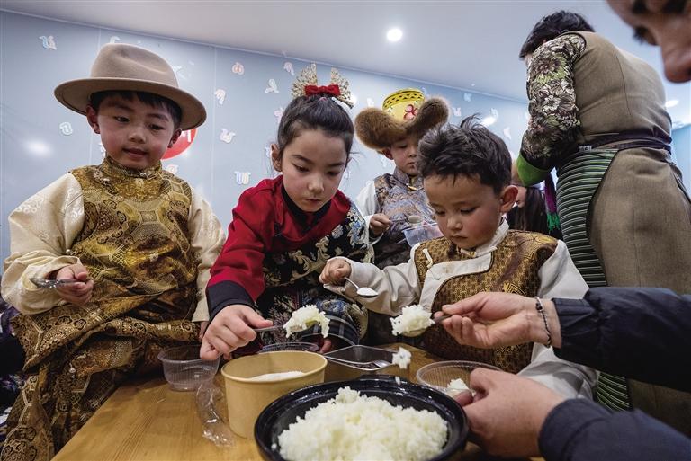诺诺儿童藏装派对上,孩子们正在制作人参果酥油饭。