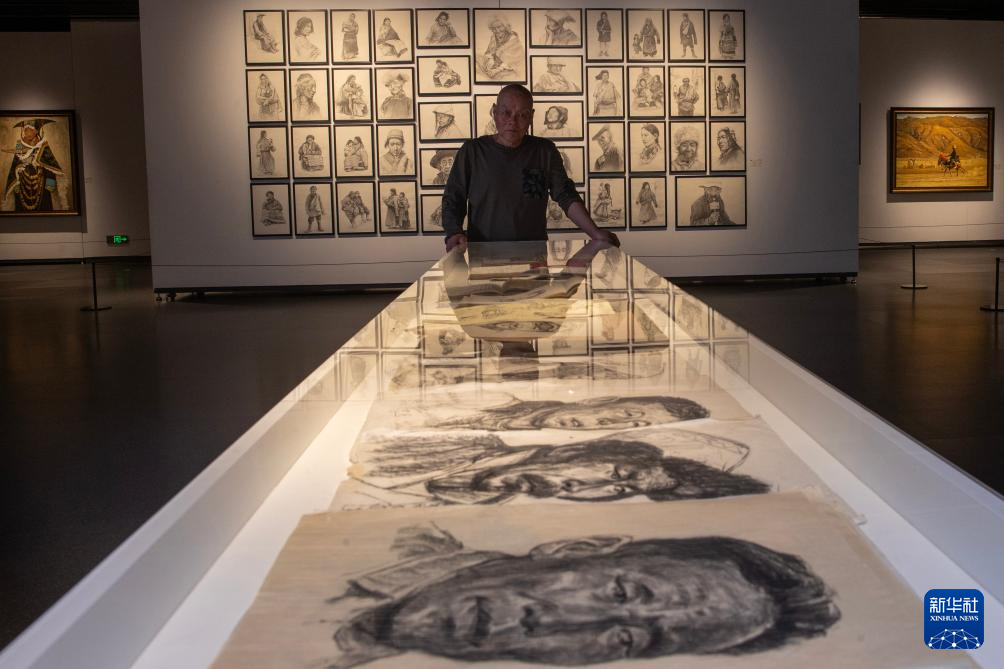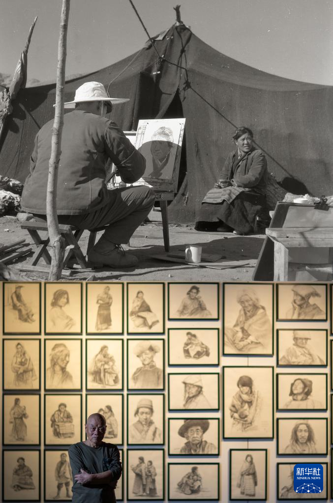 这是一张拼版照片,上图为:1983年冬,张鹰在尼木县写生(受访者供图);下图为:张鹰在西藏美术馆自己画展上的“素描墙”前(新华社记者姜帆摄5月13日摄)。新华社发