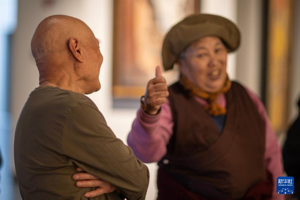一位藏族观众在西藏美术馆参观张鹰的画展时夸赞他的画(5月13日摄)。新华社记者 姜帆 摄