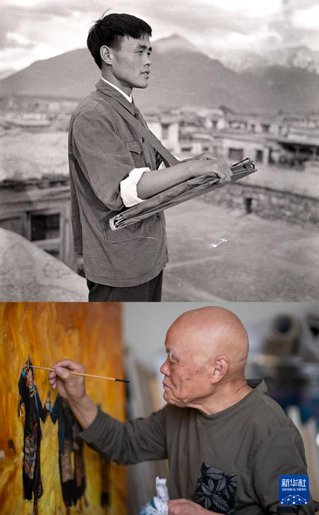 这是一张拼版照片,上图为:1973年,初到西藏不久的张鹰在八廓街房顶上写生(受访者供图);下图为:张鹰在拉萨的画室作画(新华社记者姜帆摄5月13日摄)。新华社发