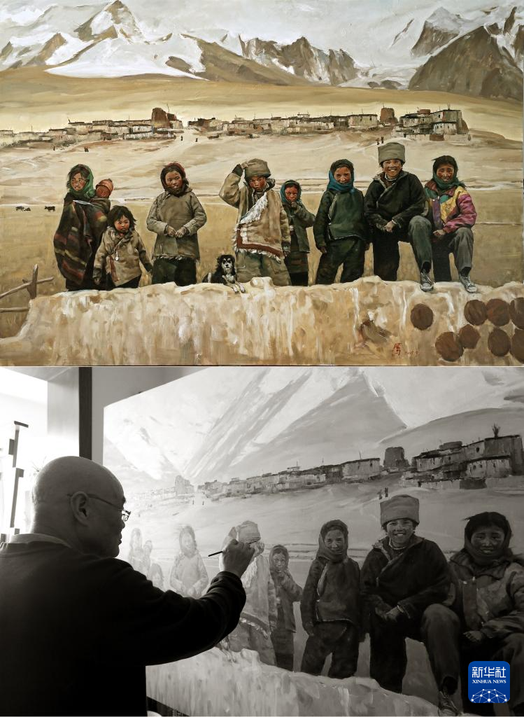 这是一张拼版照片,上图为:张鹰的代表作之一《大山里的孩子》(受访者供图);下图为:2015年,张鹰在拉萨的画室创作《大山里的孩子》(受访者供图)。新华社发