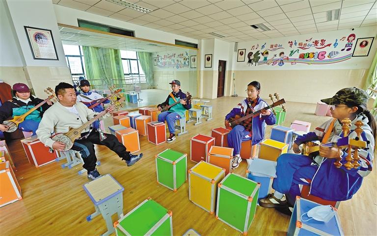 图为拉萨市第四中学学生在扎念琴社团课上与老师共同弹奏扎念琴。记者 唐斌 摄