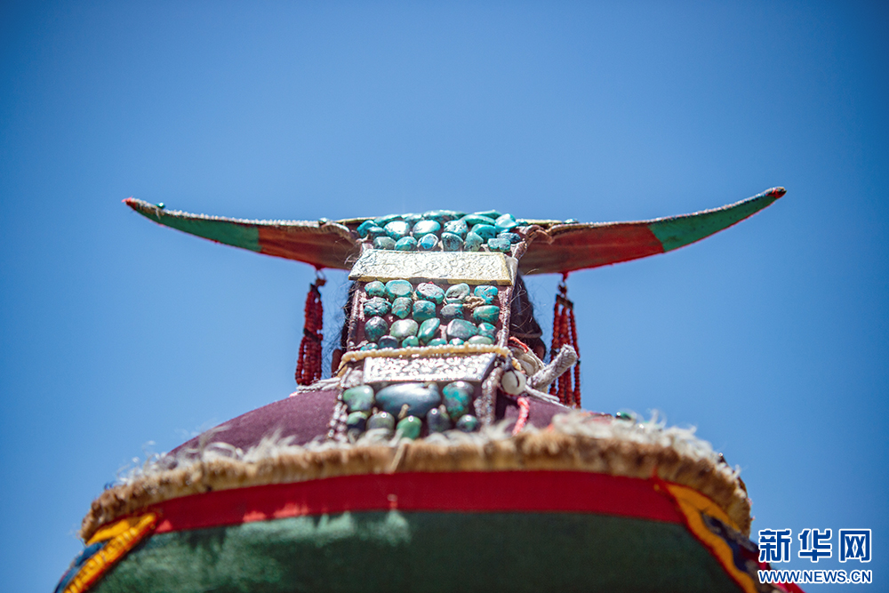 图为装点绿松石的普兰服饰头饰(6月10日摄)。新华网 旦增努布 摄