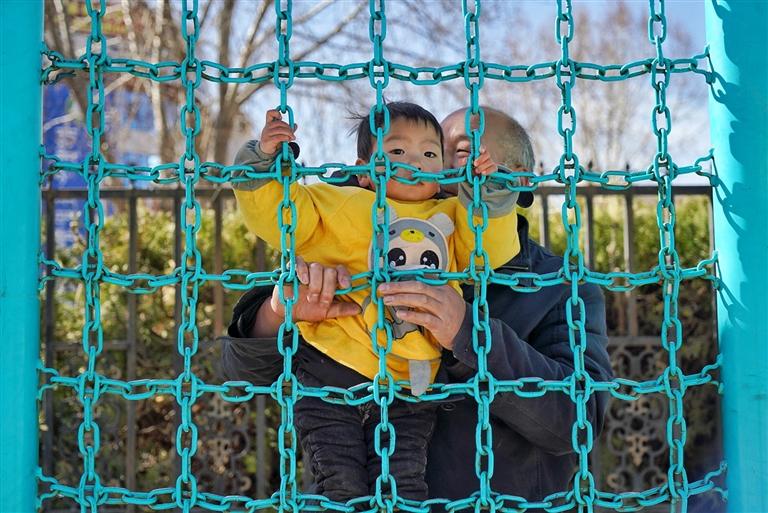 老年人在公园带着孩子玩耍。