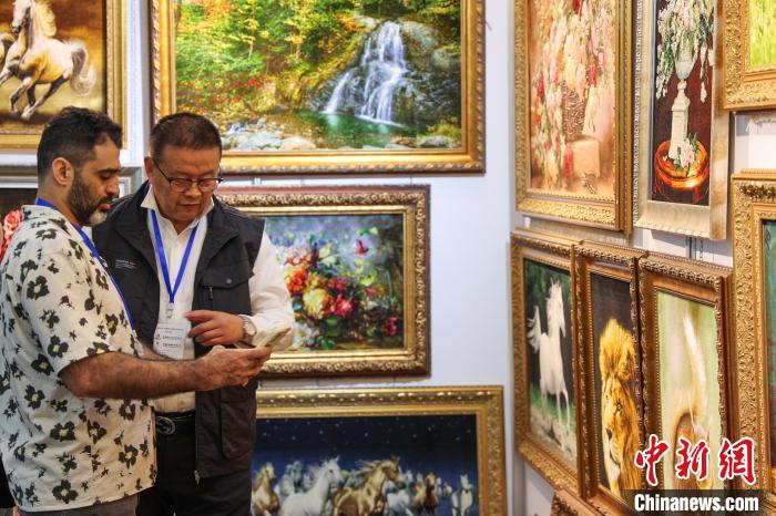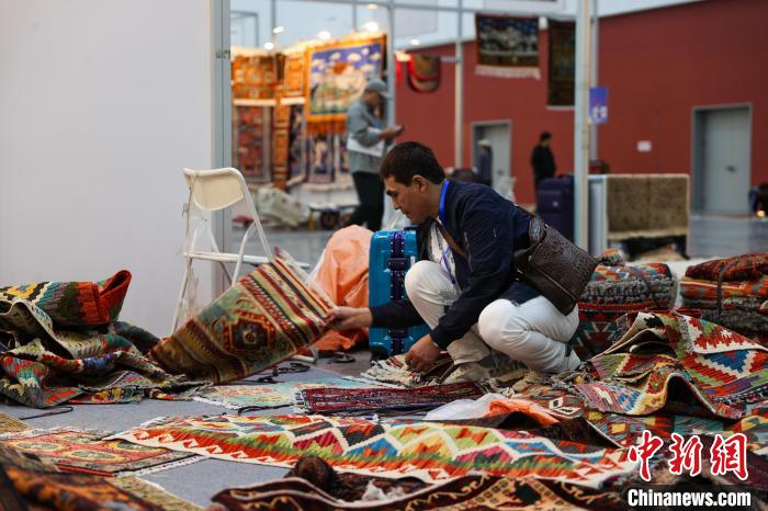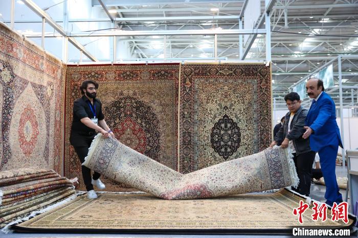 图为来自巴基斯坦的参展商在摆放地毯。中新社记者 薛蒂 摄