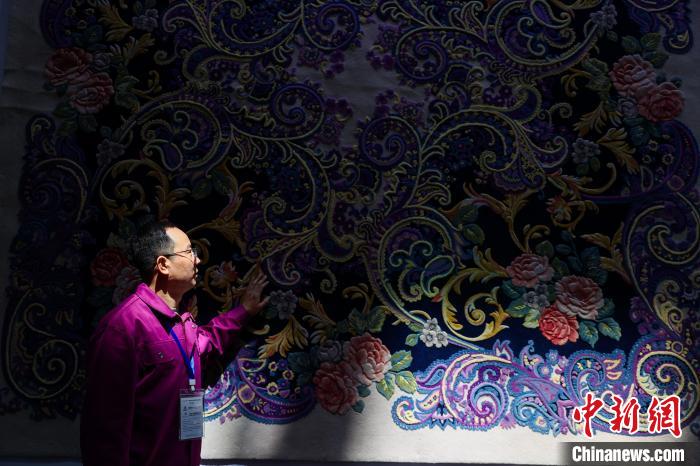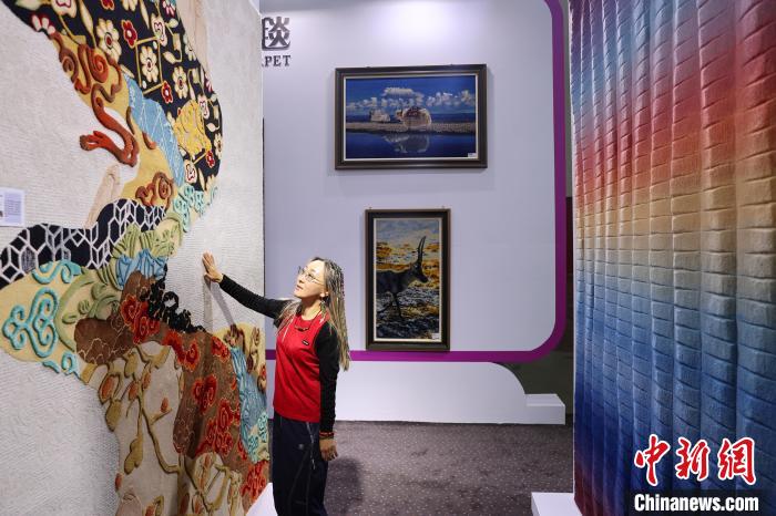 图为青海参展商介绍展出的地毯。中新社记者 薛蒂 摄