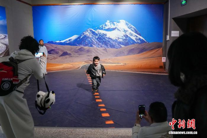 图为展览现场的西藏夏岗江雪山216国道打卡装置吸引观众。中新社记者 刘冉阳 摄