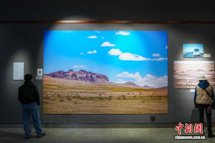 图为大幅藏羚羊照片吸引观众。中新社记者 刘冉阳 摄