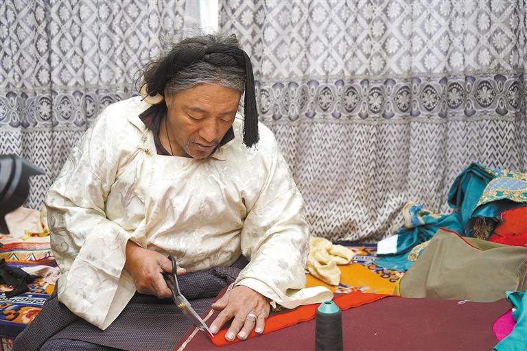 图为次欧正在裁剪藏装。记者 万靖 摄