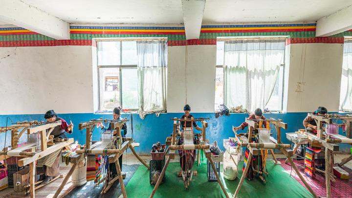 山南市贡嘎县杰德秀镇的格桑围裙农牧民专业合作社里,旦增卓嘎和合作社的妇女在编织“邦典”(2025年4月23日摄)。新华社记者 丁增尼达 摄