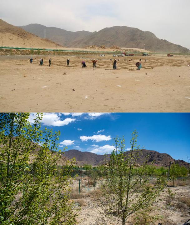 这是一张拼版照片。上图为西藏山南市贡嘎县境内拍摄的“先造后补工程”(2021年摄);下图为西藏山南市贡嘎县境内拍摄的拉萨南北山造林绿化(贡嘎段)(2025年4月24日摄)。新华网 旦增努布 摄