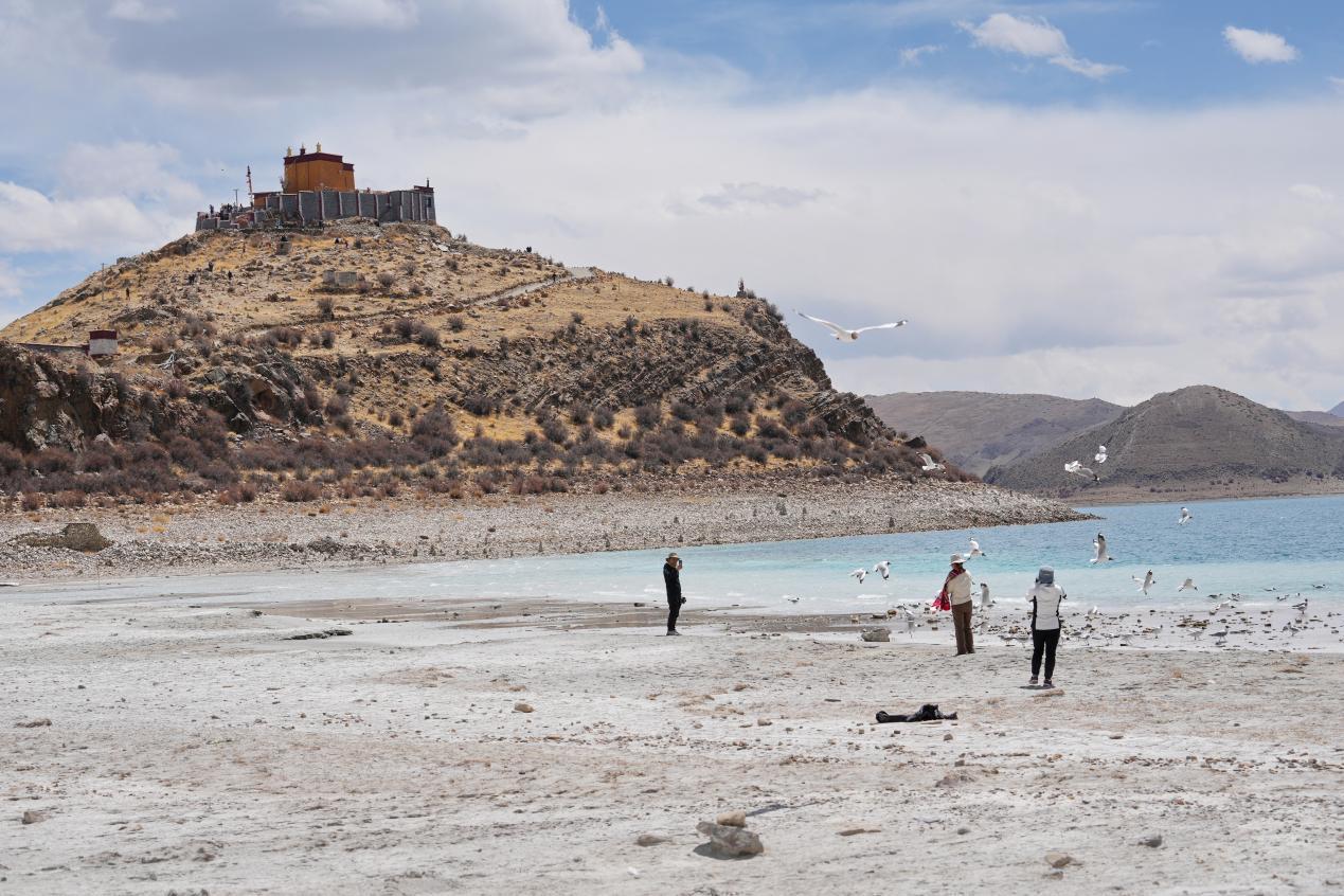游客在羊卓雍错北岸的日托寺附近投喂棕头鸥(2024年4月5日摄)。新华社记者 张汝锋 摄