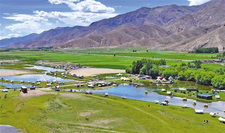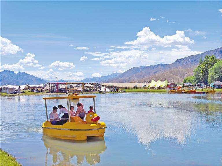 楚贵林卡位于日喀则市桑珠孜区东嘎乡楚贵村。2019年初,青岛援藏组规划盘活村集体用地,打造以自然生态景观、休闲度假旅游及异域农耕民俗文化体验为主题,融合当地文化内涵的“楚贵村生态旅游度假区”项目。项目自2022年启动以来,随着运营渐趋成熟,林卡休闲游乐设施逐年丰富。如今,这里设有咖啡休闲馆、山地摩托、真人CS、游船、骑马等多个传统与现代结合的项目,受到游客青睐。