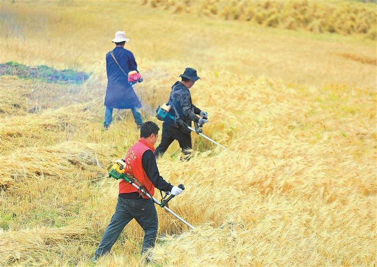 图为色扎乡党员干部与卡通村群众在收割农作物。记者 白玛泽旺 通讯员 旦增 摄