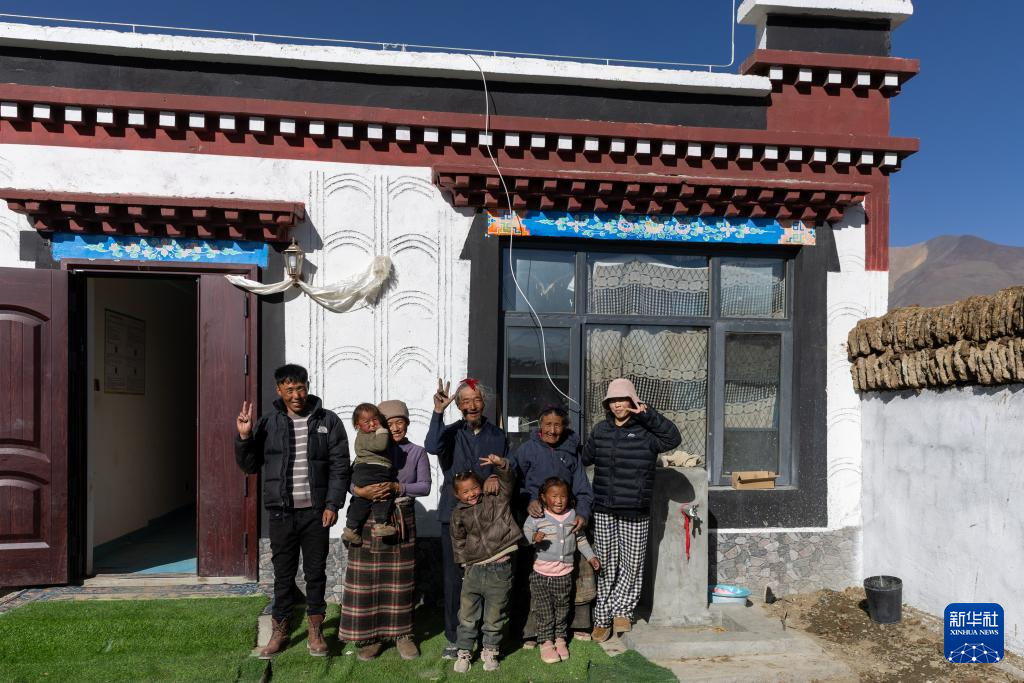 次仁拉姆(左二)和家人在新居前合影(1月5日摄)。新华社记者 姜帆 摄