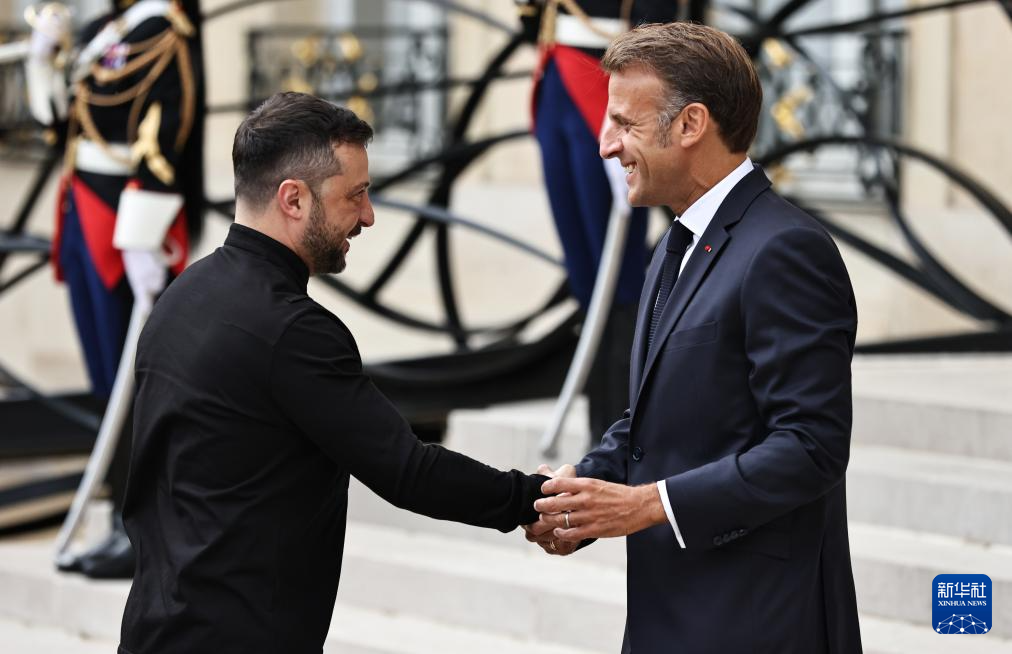 9月4日,在法国首都巴黎的总统府爱丽舍宫,法国总统马克龙(右)迎接出席“志愿联盟”线上会议的乌克兰总统泽连斯基。新华社记者 高静 摄