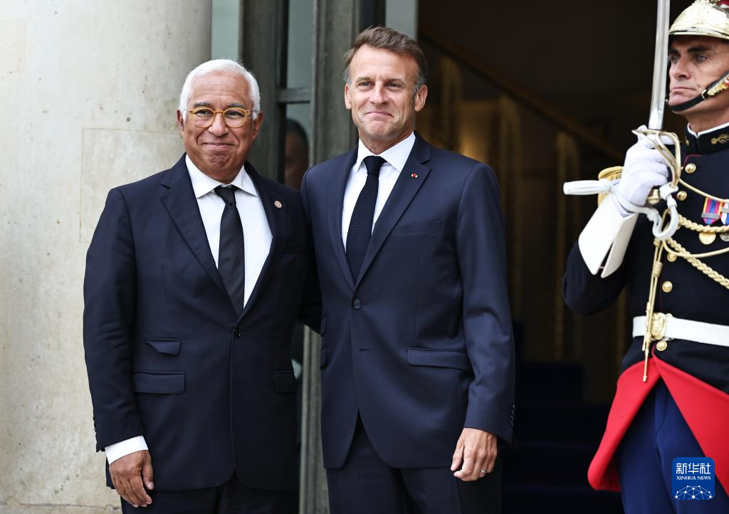 9月4日,在法国首都巴黎的总统府爱丽舍宫,法国总统马克龙迎接出席“志愿联盟”线上会议的欧洲理事会主席科斯塔(左)。新华社记者 高静 摄