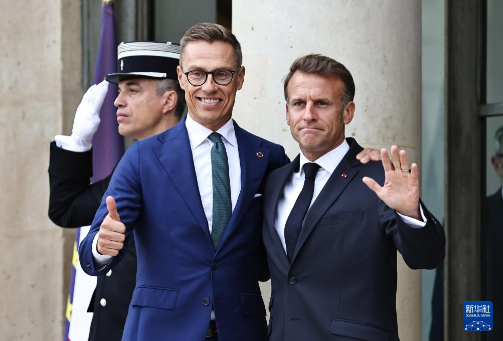 9月4日,在法国首都巴黎的总统府爱丽舍宫,法国总统马克龙(右)迎接出席“志愿联盟”线上会议的芬兰总统斯图布。新华社记者 高静 摄