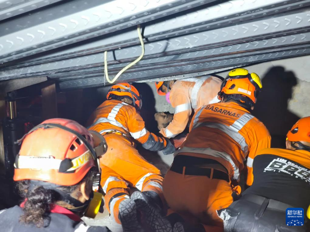 10月1日,救援人员在印度尼西亚东爪哇省诗都阿佐县建筑倒塌现场救出一名幸存者。新华社发(印尼国家搜救局供图)