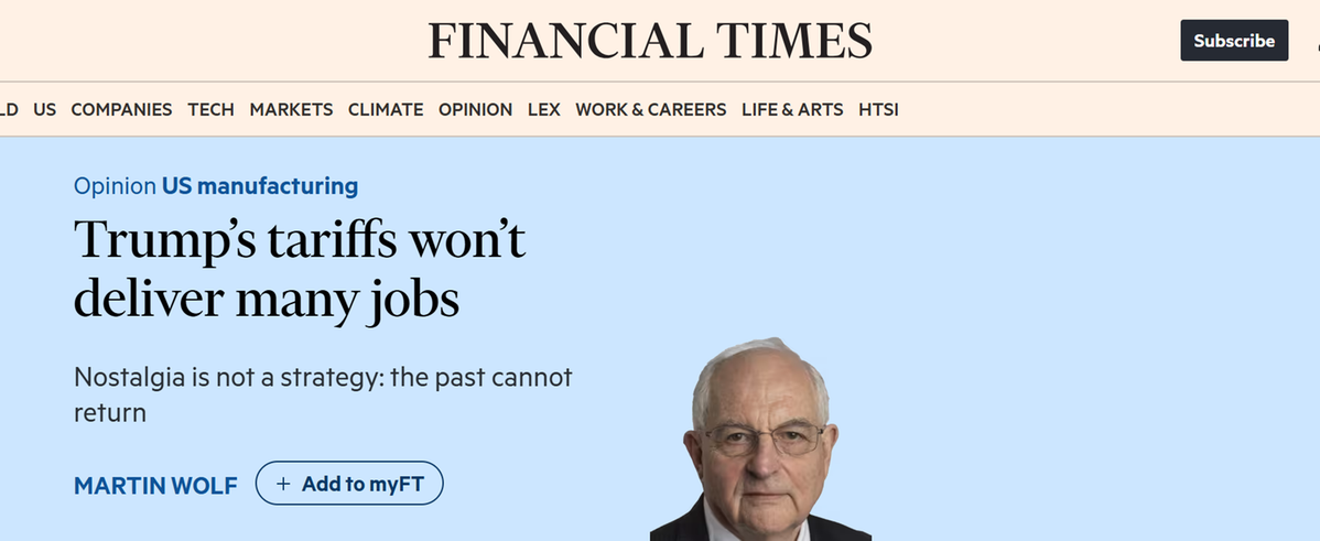 英国《金融时报》副总编及首席经济评论员马丁·沃尔夫(Martin Wolf)8日发表评论文章称,事实表明,特朗普政府推行的贸易保护主义政策,并未兑现其对选民所作的核心承诺——为美国创造大量制造业就业岗位,尤其是面向那些曾经依赖传统工业、如今却面临地区经济衰落困境的工人群体。他进一步指出,这一承诺本质上是空洞的,其政策实质是为政府自身及其背后的富豪阶层牟取利益。