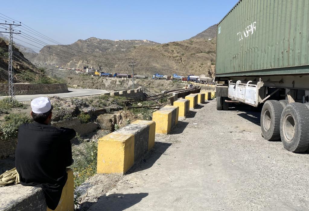 10月13日,在巴基斯坦与阿富汗的边境口岸多尔哈姆,卡车因边境地区冲突而滞留。新华社发
