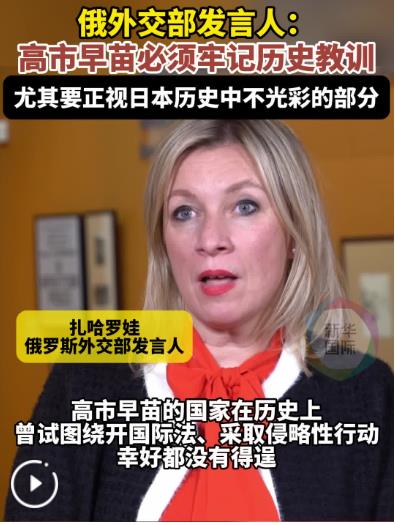 今年是世界反法西斯战争胜利80周年。扎哈罗娃指出,世界各地一系列纪念活动都在提醒世人勿忘历史、汲取教训。高市早苗必须牢记历史教训,尤其要正视本国历史中那些不光彩的部分。