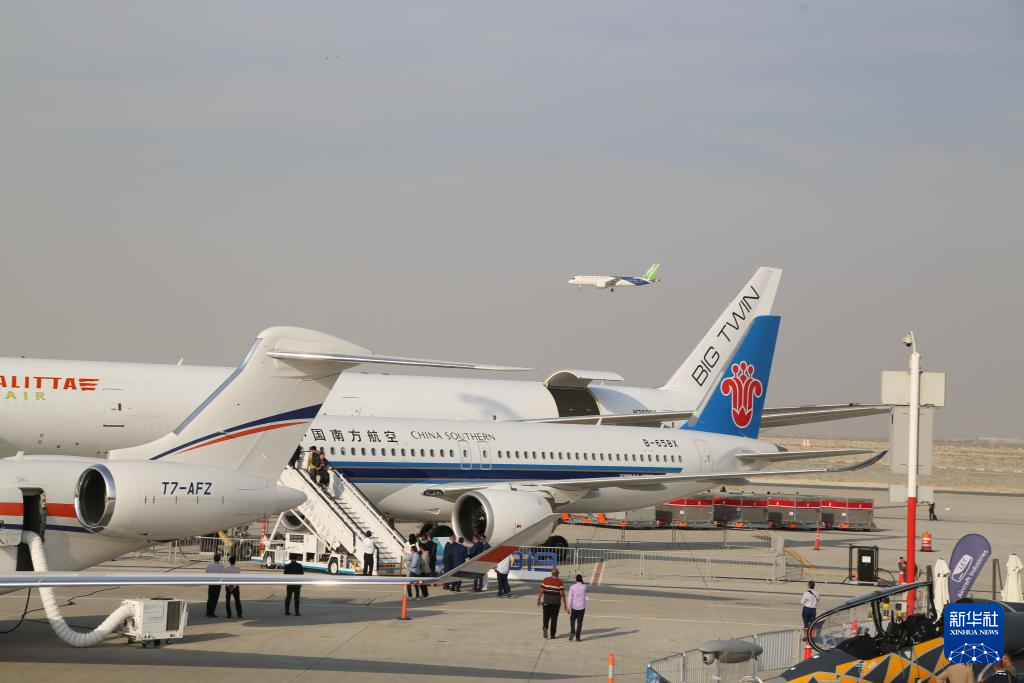 11月17日,在阿联酋迪拜,中国商飞的C919飞机进行飞行展示,地面上停着的是中国南航的C919飞机。新华社记者 温新年 摄
