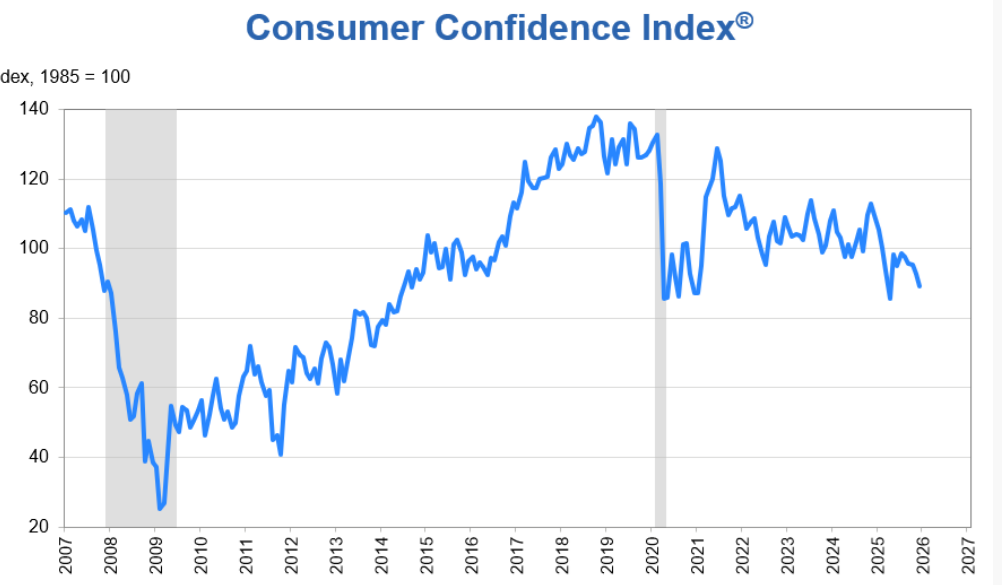 世界大型企业研究会首席经济学家达娜·彼得森表示,尽管11月的数据因联邦政府“停摆”结束而被向上修正,12月消费者信心再次下滑并依然远低于今年1月的峰值。消费者信心指数5个成分指数中有4个出现下降,另一个表现明显疲弱。