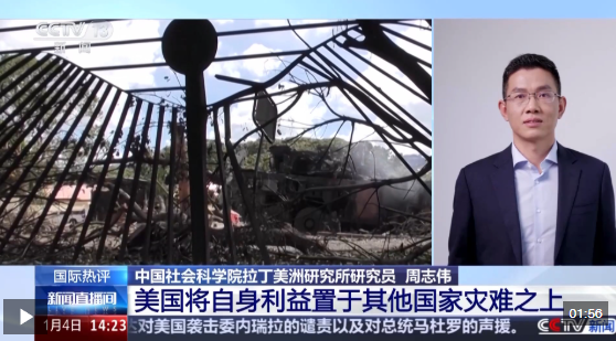 中国社会科学院拉丁美洲研究所研究员 周志伟:从这次行动的实质来看的话,体现出美国霸权行径挑战国际法,挑战国际关系的准则,将美国的利益置于其他国家的灾难之上。我觉得这件事是对国际法的野蛮践踏,将进一步加剧国际社会对于美国的不信任感。