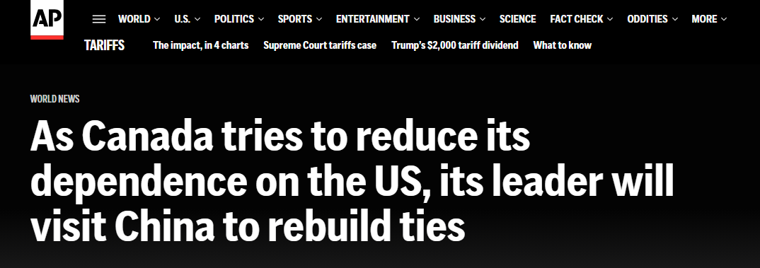 美联社报道称,加拿大总理此次访华,旨在修复并改善两国关系,为中加战略伙伴关系的发展重新注入活力。报道援引卡尼的表态指出:“加拿大正在全球范围内构建新的伙伴关系,以改变本国经济对单一贸易伙伴的依赖。”