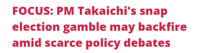 日本高市早苗内阁1月23日通过众议院解散决议书,这是日本众议院60年来首次在国会例会开幕日即遭解散。多家外媒分析认为,高市此举将党派利益置于国民利益之上,是一场罔顾经济民生的“政治赌博”。