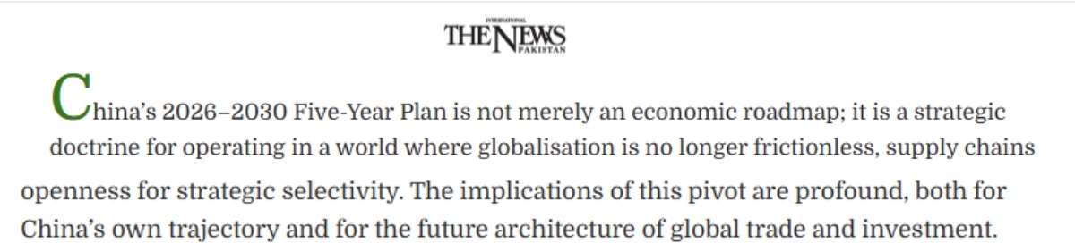 巴基斯坦《国际新闻报》近日刊文称,“十五五”规划纲要对中国而言不仅仅是一份经济路线图,更是一项战略方针。它不仅关乎中国自身的发展轨迹,也影响未来全球贸易和投资格局。