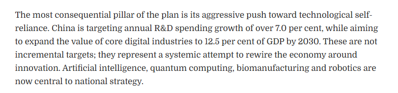 文章认为,“十五五”规划纲要最具分量的支柱,在于对科技自立自强的强力推进。中国明确提出,研发经费支出年均增长将超过7.0%,并力争到2030年,核心数字经济产业增加值占GDP的比重提升至12.5%。这些并非渐进式目标,而是一场以创新为核心、系统重构经济体系的战略转型。人工智能、量子计算、生物制造与机器人技术,已全面上升为国家战略的核心。