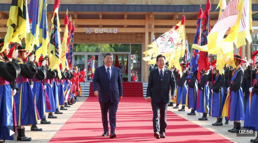 当地时间11月1日下午,韩国总统李在明在庆州博物馆为中国国家主席习近平举行欢迎仪式。