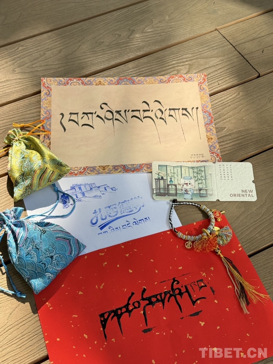 图为卓嘎在活动现场书写祝福语“扎西德勒” 摄影:赵佳