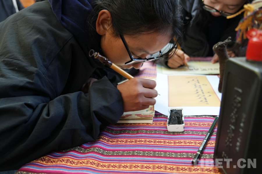 图为同学们手拿传统竹笔跟藏族老师学写藏文 摄影:赵佳