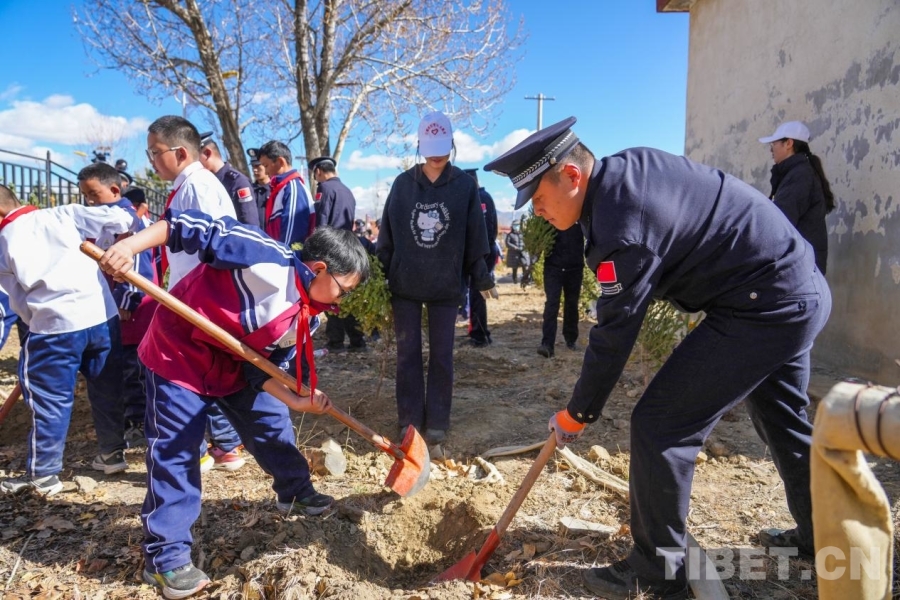 西藏日喀则边境管理支队组织民警和少先队员清扫烈士陵园周边环境