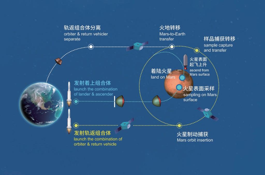 地月距离约38万公里,而地球与火星的平均距离约4亿公里。“火星比月球距离远得多,环境也更加复杂。”刘继忠介绍,受限于目前火箭的运载能力,原先通过一次发射实现月球取样,但在火星取样任务则需要两次发射。中国计划2028年在海南文昌用40天左右的时间,使用两枚长征五号运载火箭,分两次发射天问三号的轨道器、返回器组合体和着陆器、上升器组合体。