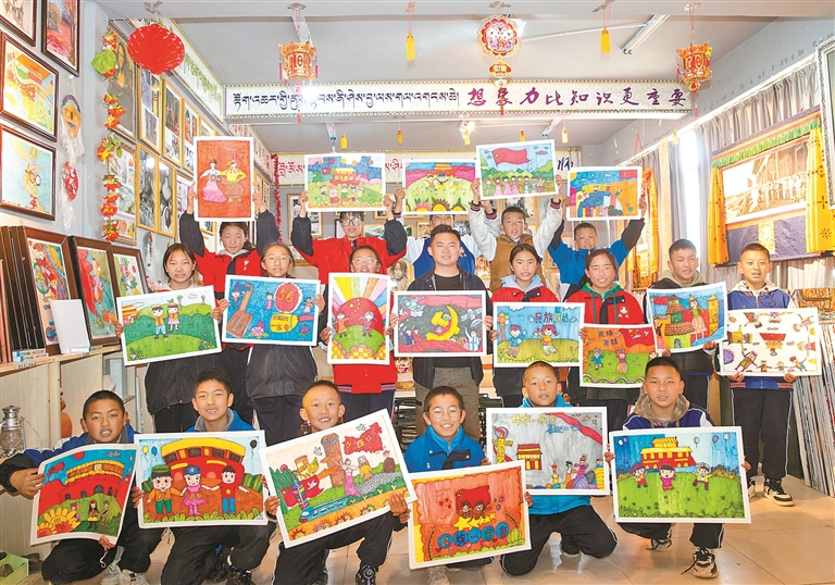 山南市桑日县中学美术兴趣社团的学生展示自己的以“铸牢中华民族共同体意识”为主题的绘画作品。记者 洛桑 通讯员 次仁龙布 摄