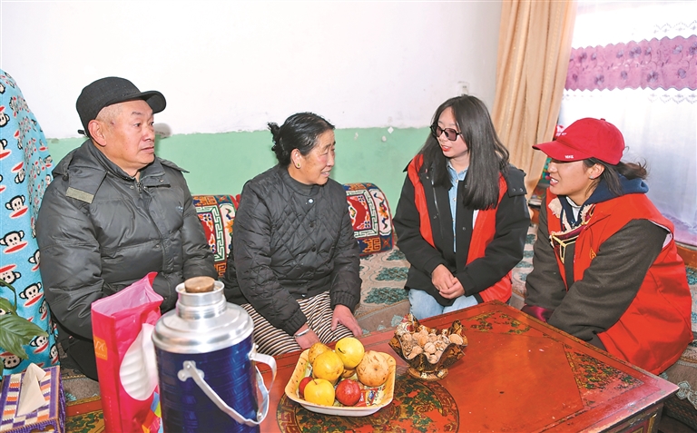 拉萨市城关区策门林社区的工作人员正在与辖区内的民族团结家庭唠家常。记者 唐斌 摄