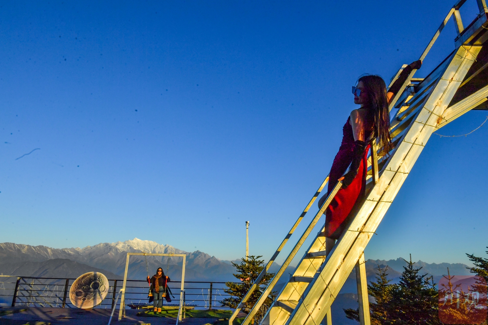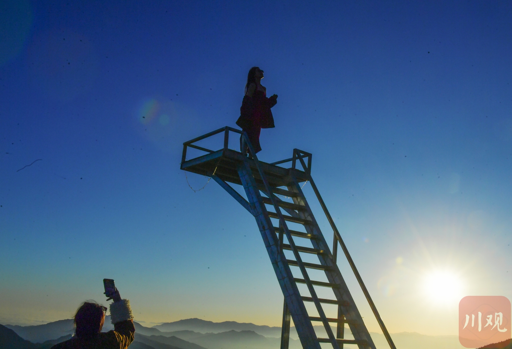 2025年12月18日清晨,游客在四川省甘孜藏族自治州泸定县兴隆镇化林村海拔2080多米的星空房附近拍摄日出。李向雨 摄