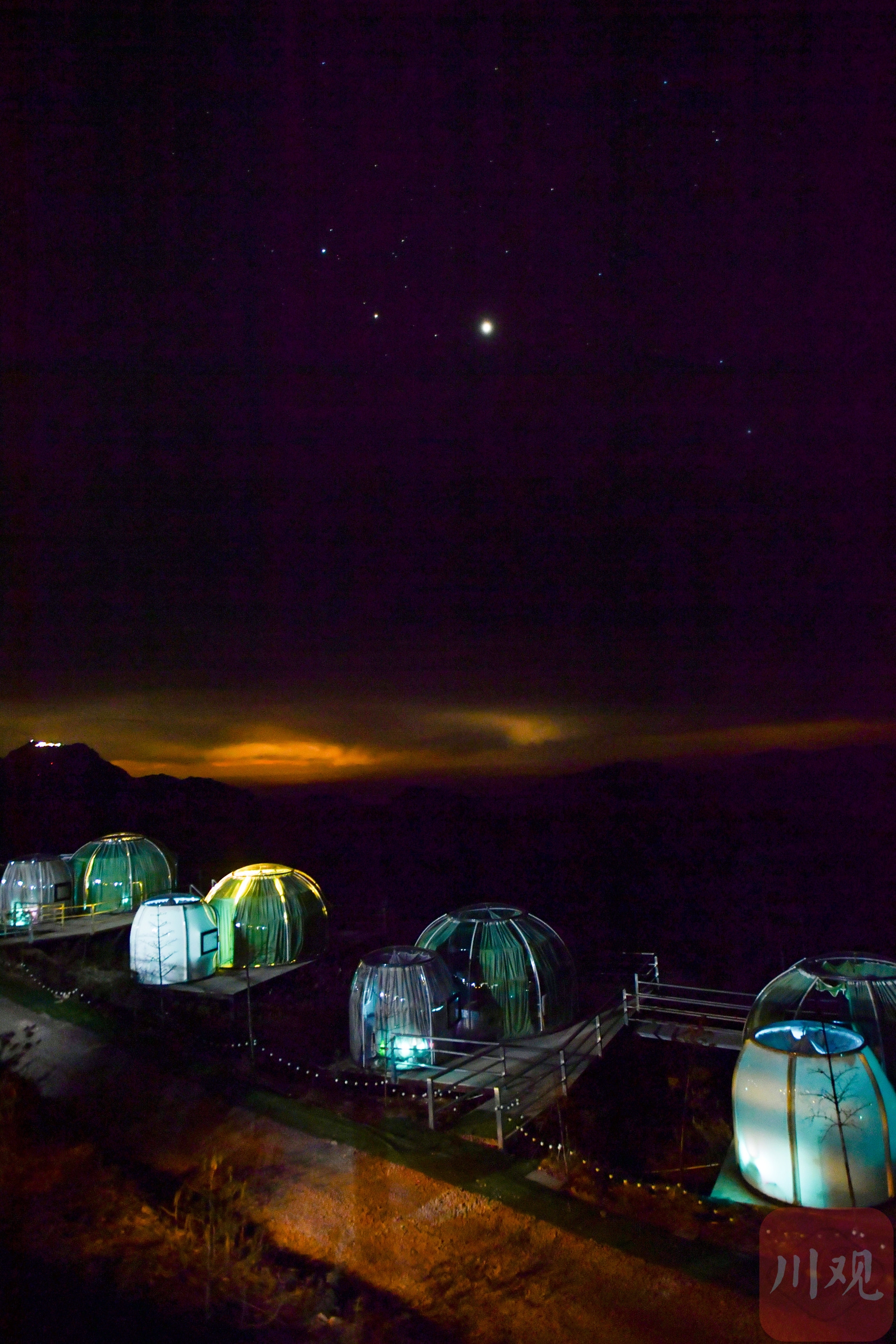 2025年12月17日晚,游客在四川省甘孜藏族自治州泸定县兴隆镇化林村海拔2080多米的星空房休闲娱乐。李向雨 摄